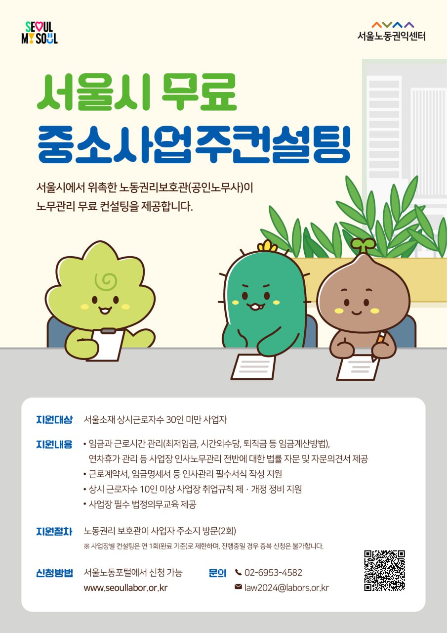 서울시에서 위촉한 노동권리보호관이 임금, 근로시간, 연차휴가 등 노무관리 컨설팅을 제공합니다.